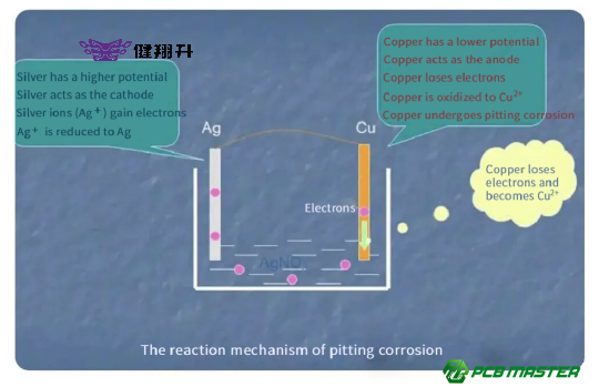 当铜在原电池中充当阳极时,就会发生腐蚀。此时,铜会失去电子并发生氧化反应。在此过程中,铜表面的原子会失去电子,转化为铜离子(Cu²⁺)。这些电子通过金属内部流动,向银层(阴极)方向移动。随后,铜离子会溶解到周围的水分或电解质中。这种铜的溶解会加速腐蚀,因为材料正在流失,从而削弱了PCB的结构。