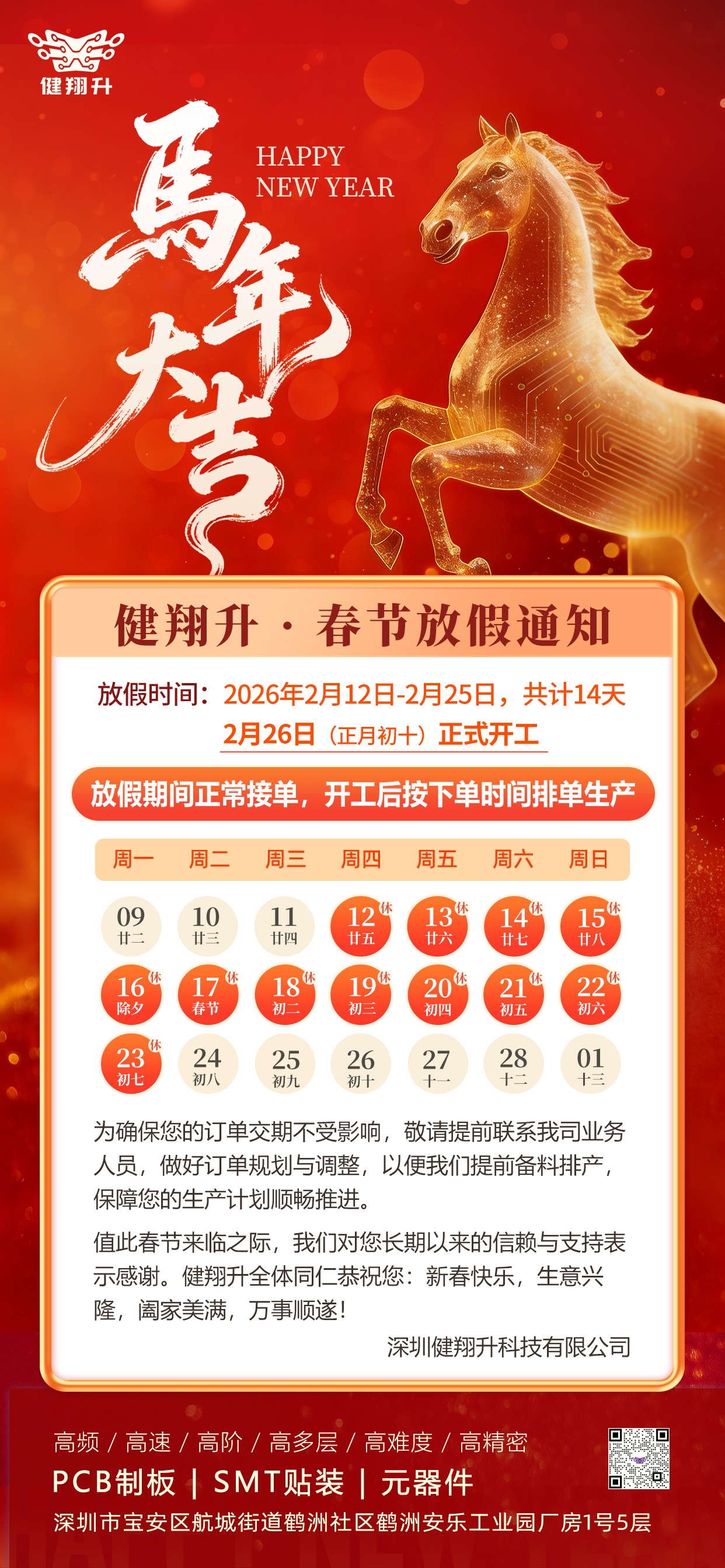 马蹄启新程,万象赴新篇,值此2026丙午马年春节来临之际,首先衷心感谢各位用户朋友一直以来对深圳健翔升的信任与鼎力支持!